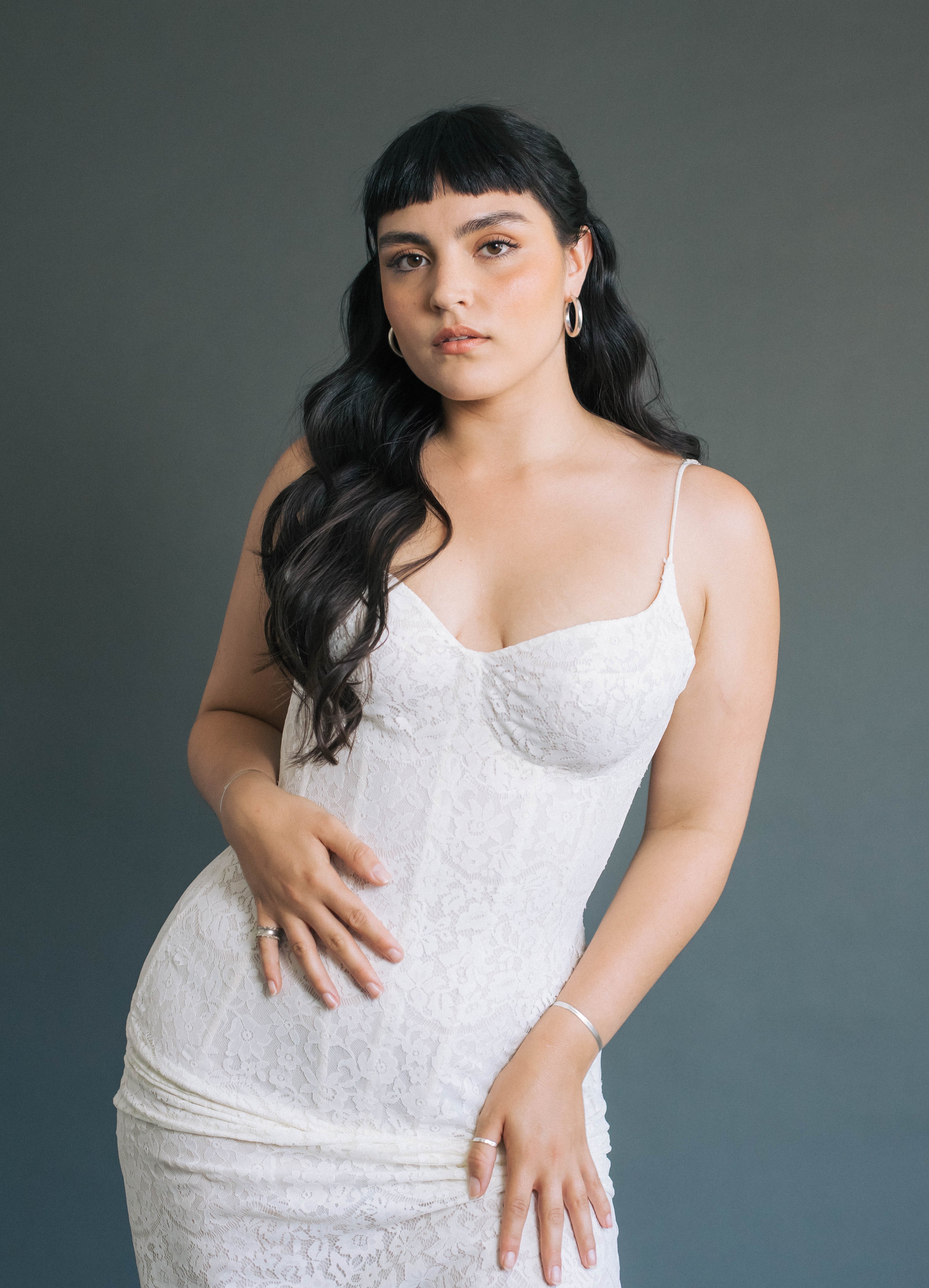 A structured, fitted gown with a built in corset and seamless floral lace draped around the body to hug every curve.