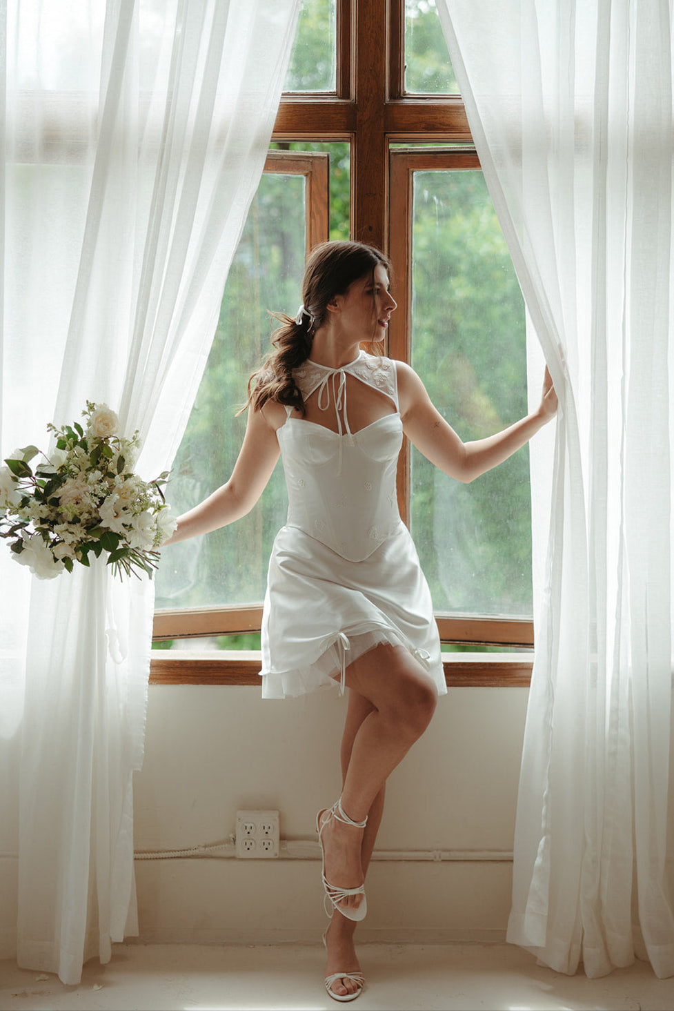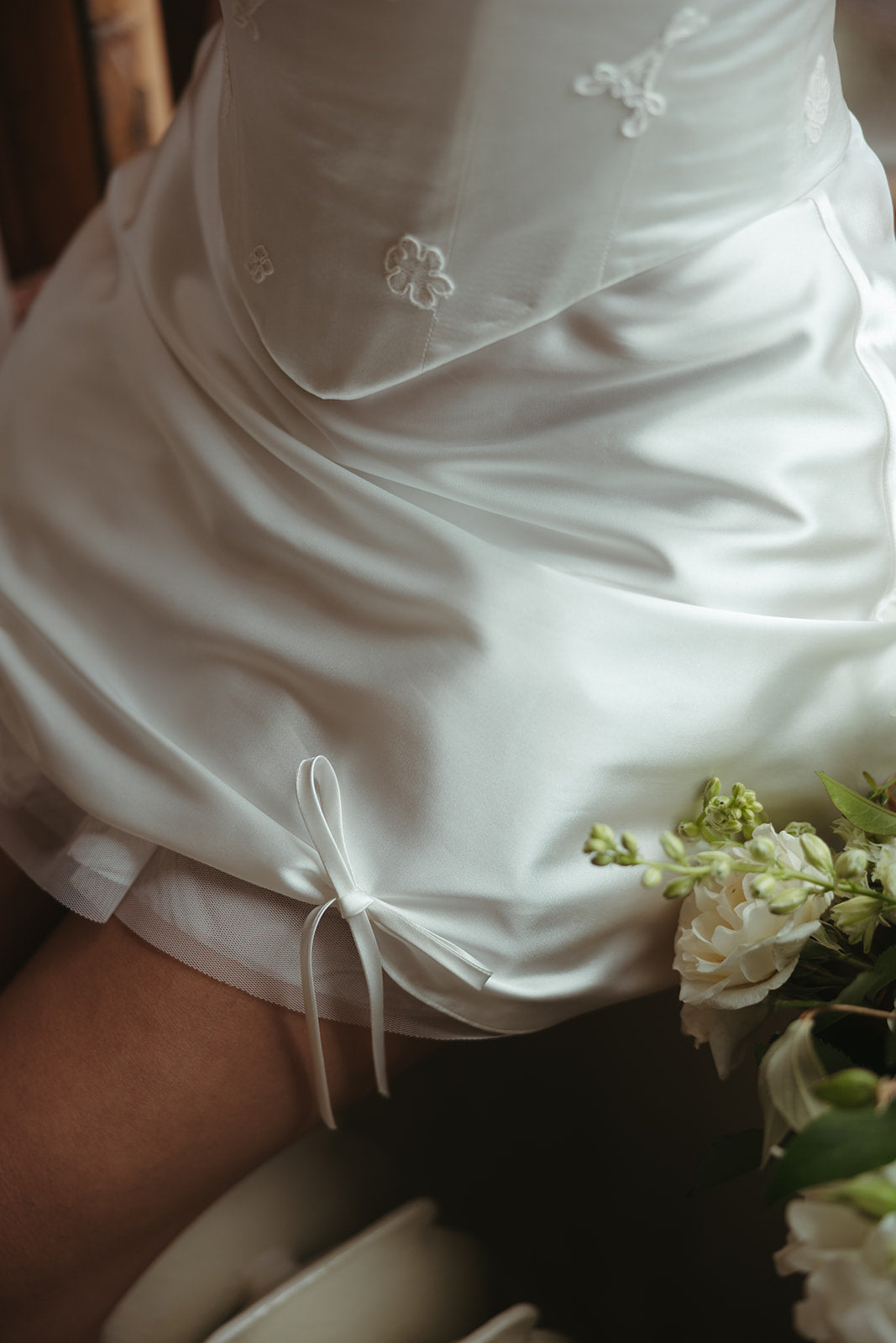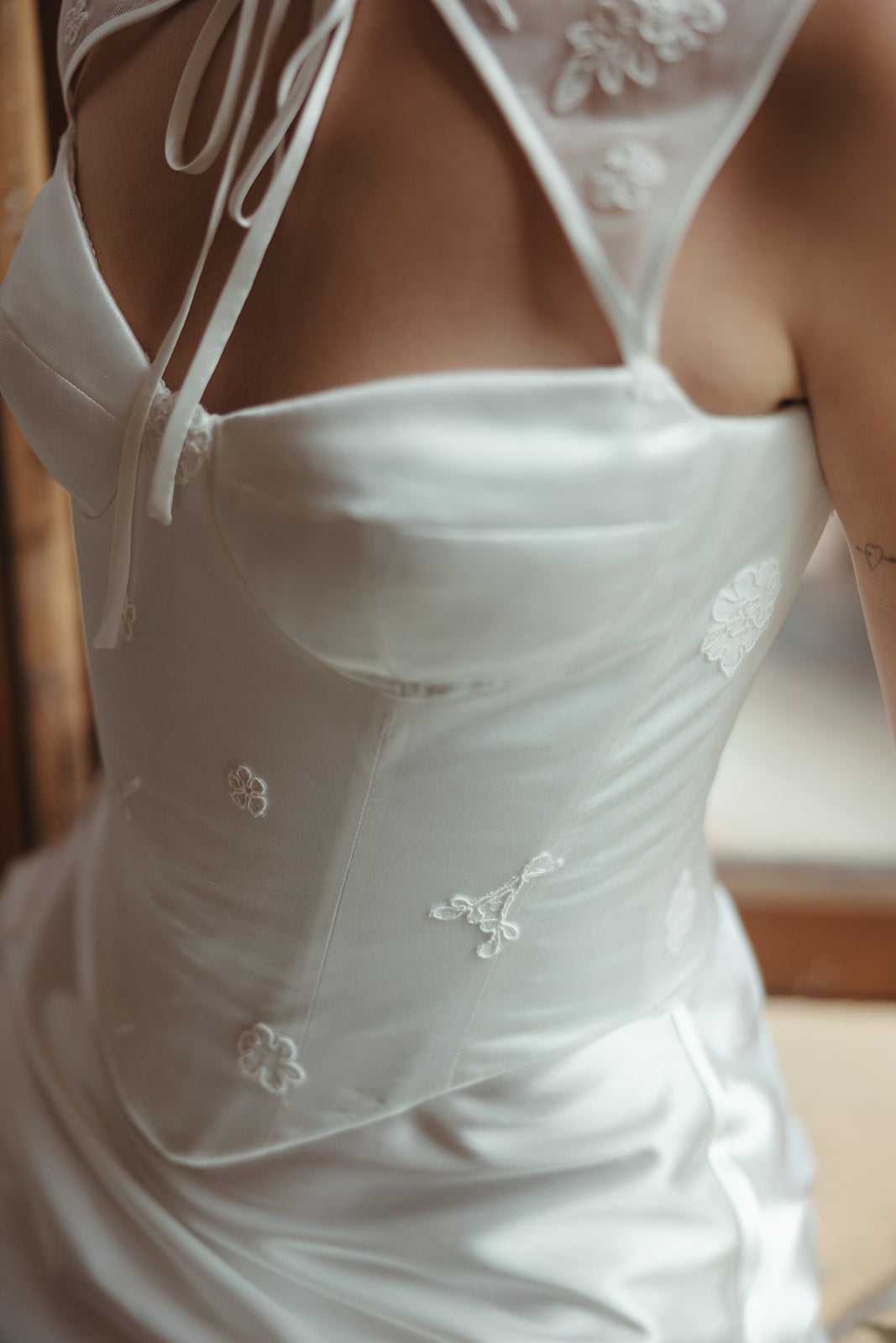 A timeless white satin set with a twist- this reception look features a lingerie inspired high neckline with long ties in the centre adorned by small lace flowers sporadically stitched throughout. The matching skirt features fine layers of white tulle below the hem and two bows gently hanging down each leg. The photographs are by Haven House Photographic.