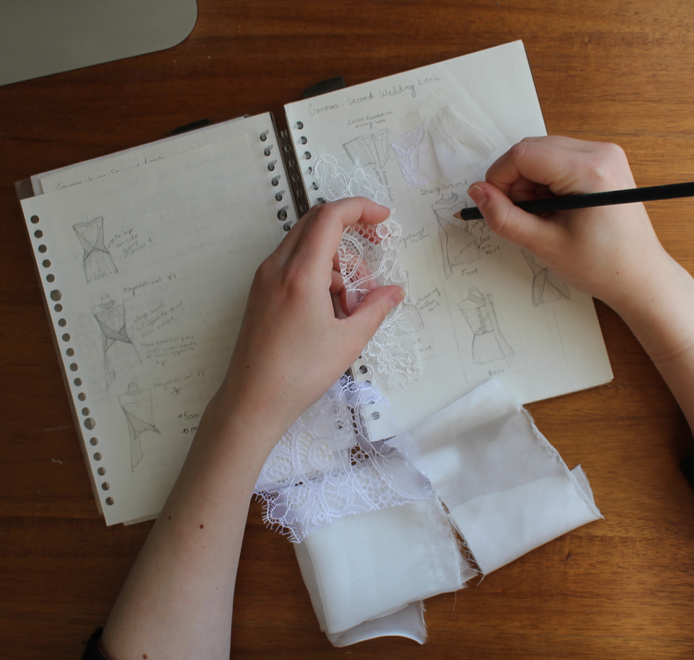 Once we decide to move forward, I’ll begin by drafting your design and taking detailed measurements. We’ll look at fabric options together and finalize the overall concept. This stage is collaborative and flexible — whether you know exactly what you want or are still exploring, I’ll help guide the design to reflect your style and story.